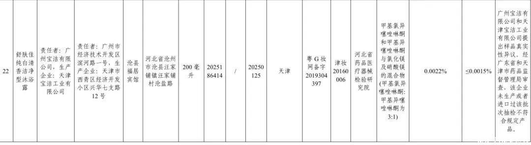 宣布暴露,1批次居品标签标示为广州宝洁有限公司(职守者),天津宝洁工业有限公司出产的舒肤佳纯白幽香洁净型沐浴露(标示批号2025186414),被检出甲基氯异噻唑啉酮和甲基异噻唑啉酮与氯化镁及硝酸镁的羼杂物(甲基氯异噻唑啉酮:甲基异噻唑啉酮为3∶1)含量为0.0022%,浓度超标。