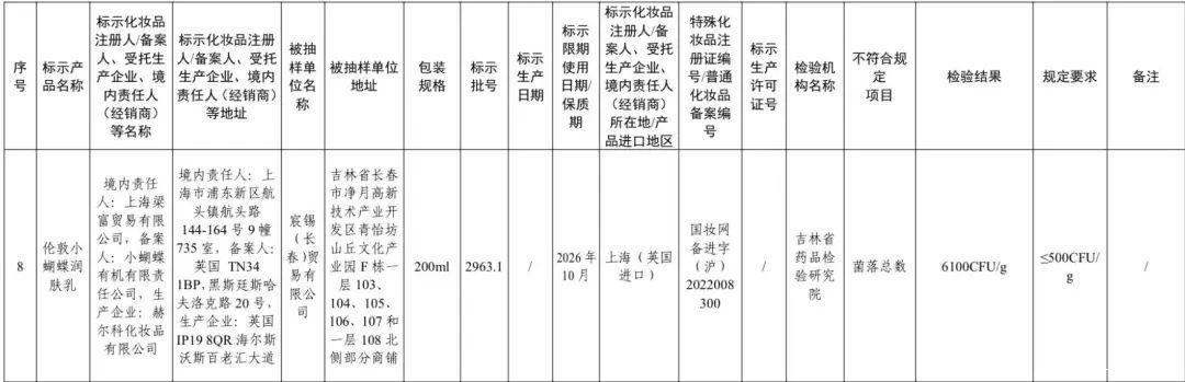 抽检遵循暴露,1批次标称上海梁富买卖有限公司(境内职守东谈主),小蝴蝶有机有限职守公司(备案东谈主),赫尔科化妆品有限公司出产的伦敦小蝴蝶润肤乳,被检出菌落总和6100CFU/g,超标12倍,规则条款为≤500CFU/g。
