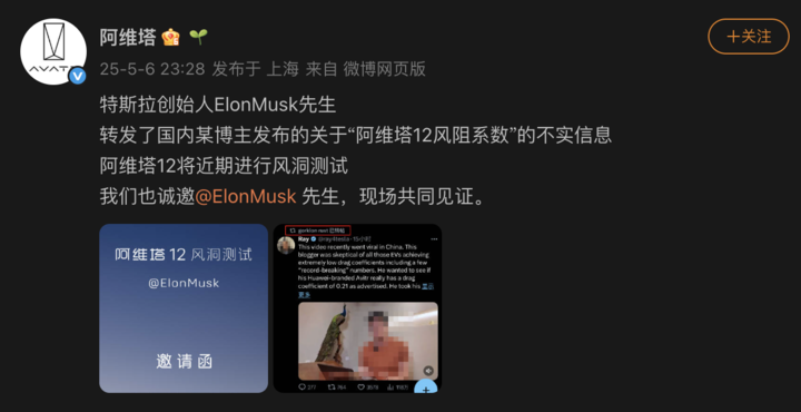 5 月 6 日,特斯拉首创东说念主马斯克转发了上述博主「风阻测试」的揣测内容。随后,阿维塔发文「隔空喊话」马斯克,邀请后者一同现场见证「阿维塔 12」的风洞测试。
