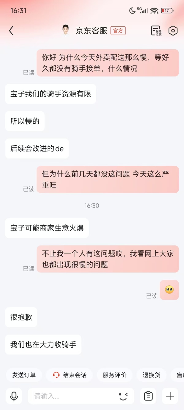 对于上述情况,咱们商量了京东客服,客服方面暗意,京东外卖面前骑手资源有限,因此配送时效较慢,何况商家生意火爆亦然影响配送身分之一,平台现正随心招募骑手,以确保资源实足。
