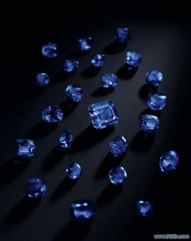 其中最大的那颗呈浓郁的皇家蓝色,未经优化措置,晶体如高档天鹅绒般丝滑。摄取祖母绿切割花样,展现出极佳的相持净度和情态均匀度,是对高品性相持的致意。其余 22 颗遴选枕形切割,一方一圆,视觉冲击力极强。