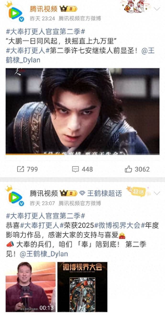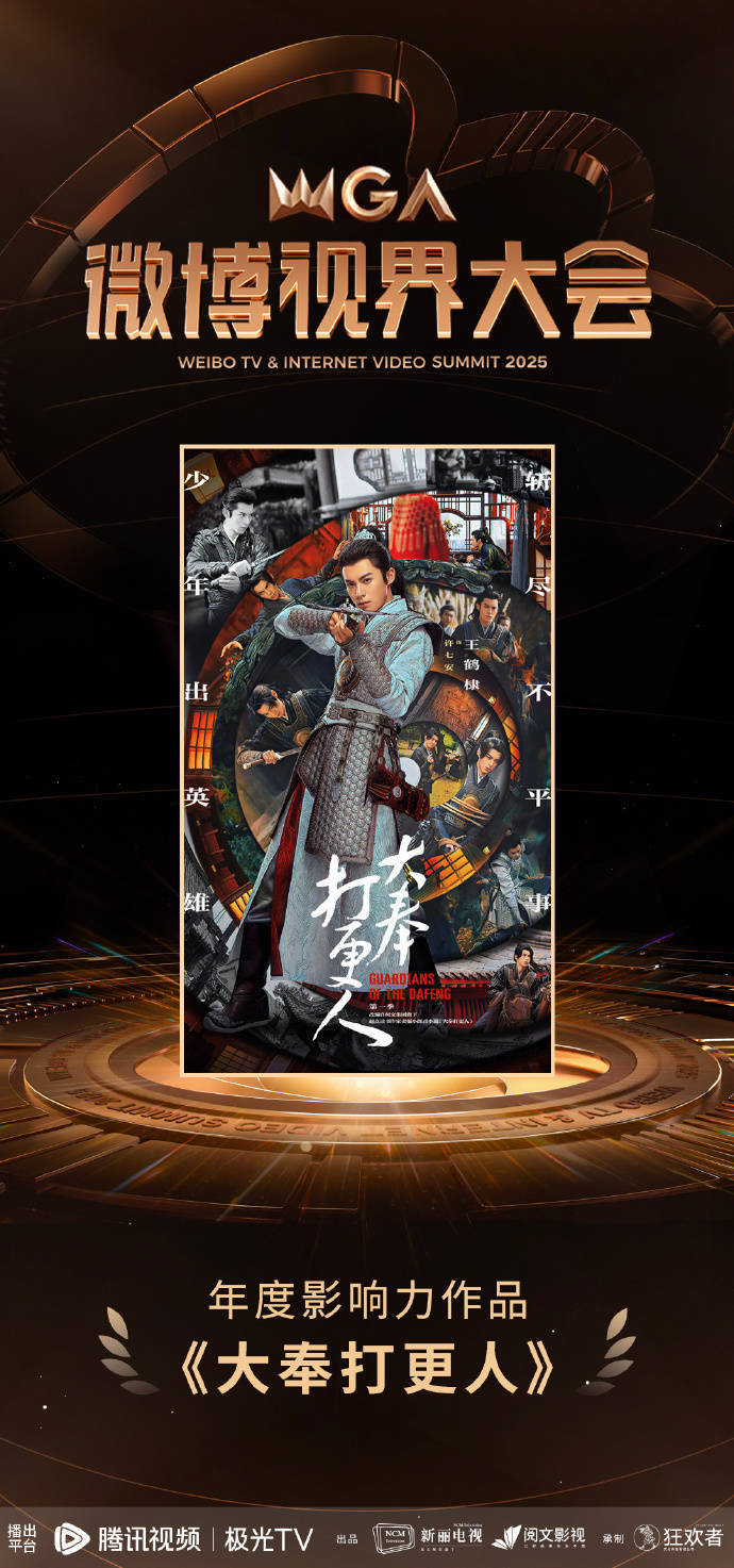 尽管《大奉击柝东说念主》已于岁首播毕,但播毕10个月仍稳居腾讯视频热度榜TOP6,在云合数据统计中全年播放市占率断层第一。是以第一季在这次嘉会上荣获“2025微博视界大会年度影响力作品”,其长尾效应显赫。
