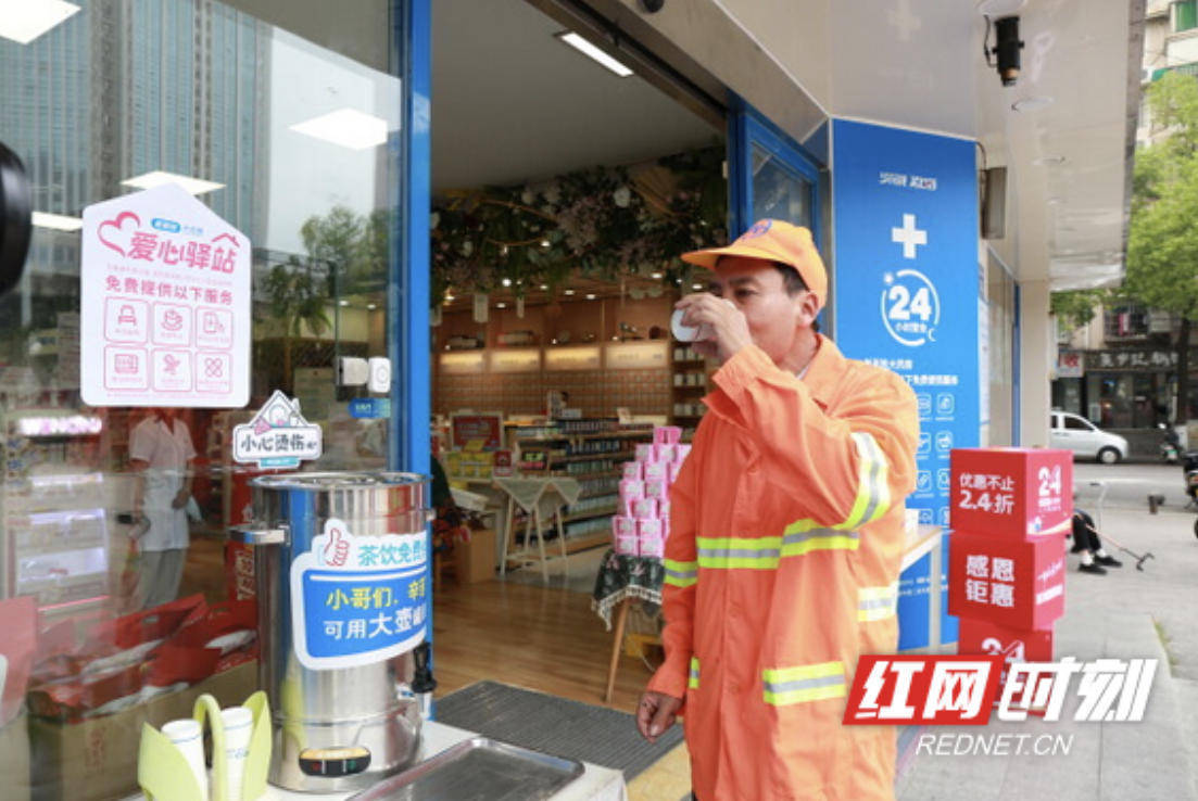 清洁工东谈主在老匹夫大药房一门店缔造的爱心驿站喝水休息。而已图