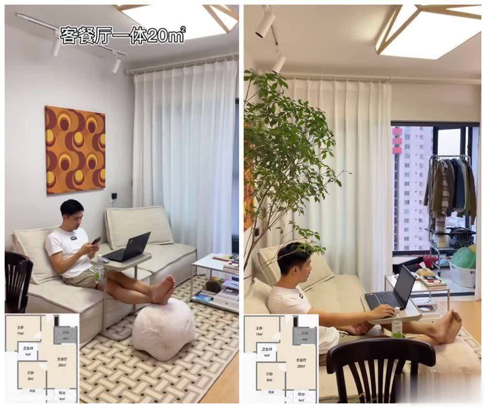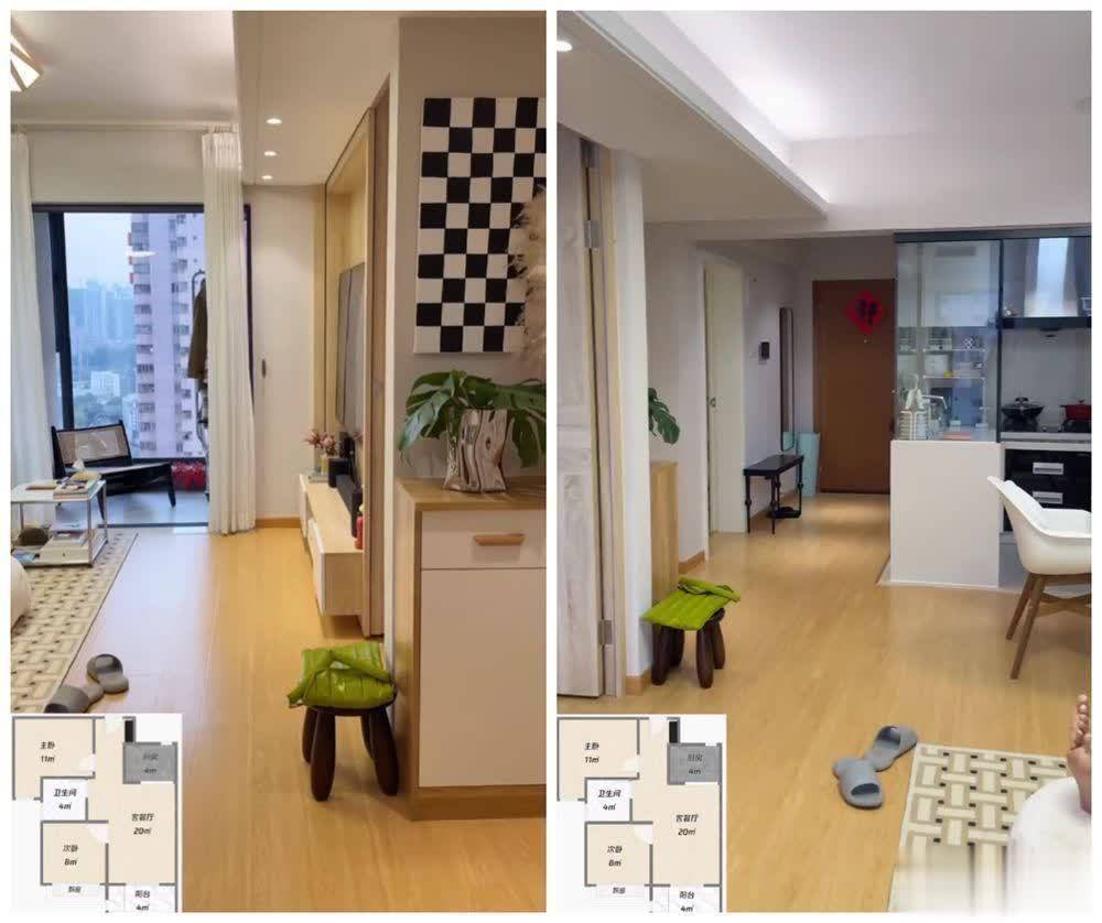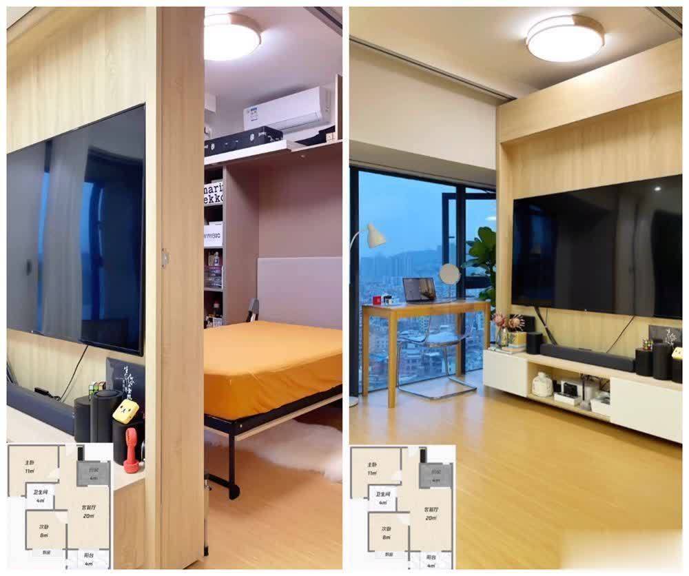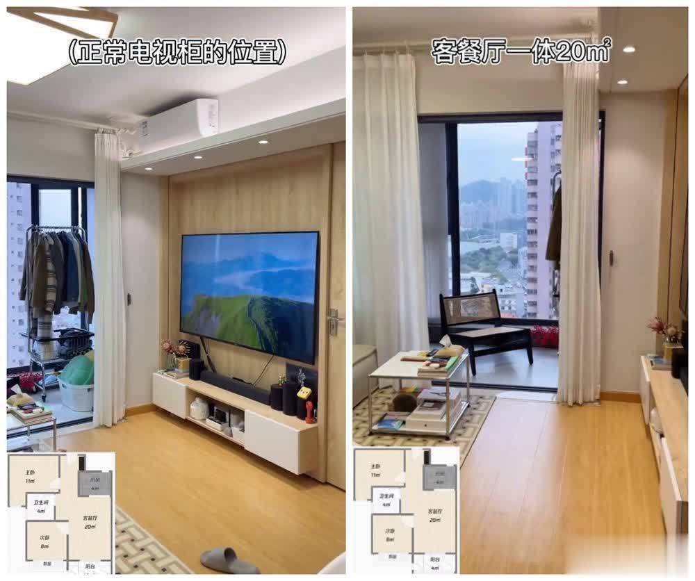 “解锁”电视柜,发现也能推拉移动!平淡不必时,推到主卧床铺收起的墙壁位置,客厅空间又变大。