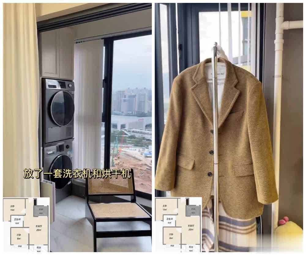 终末说说阳台和卫生间。阳台本盘算推行动念失业式,因空间受限只可作念成使命阳台,堆叠摆放洗衣机和烘干机,抖擞洗衣、曝晒功能。