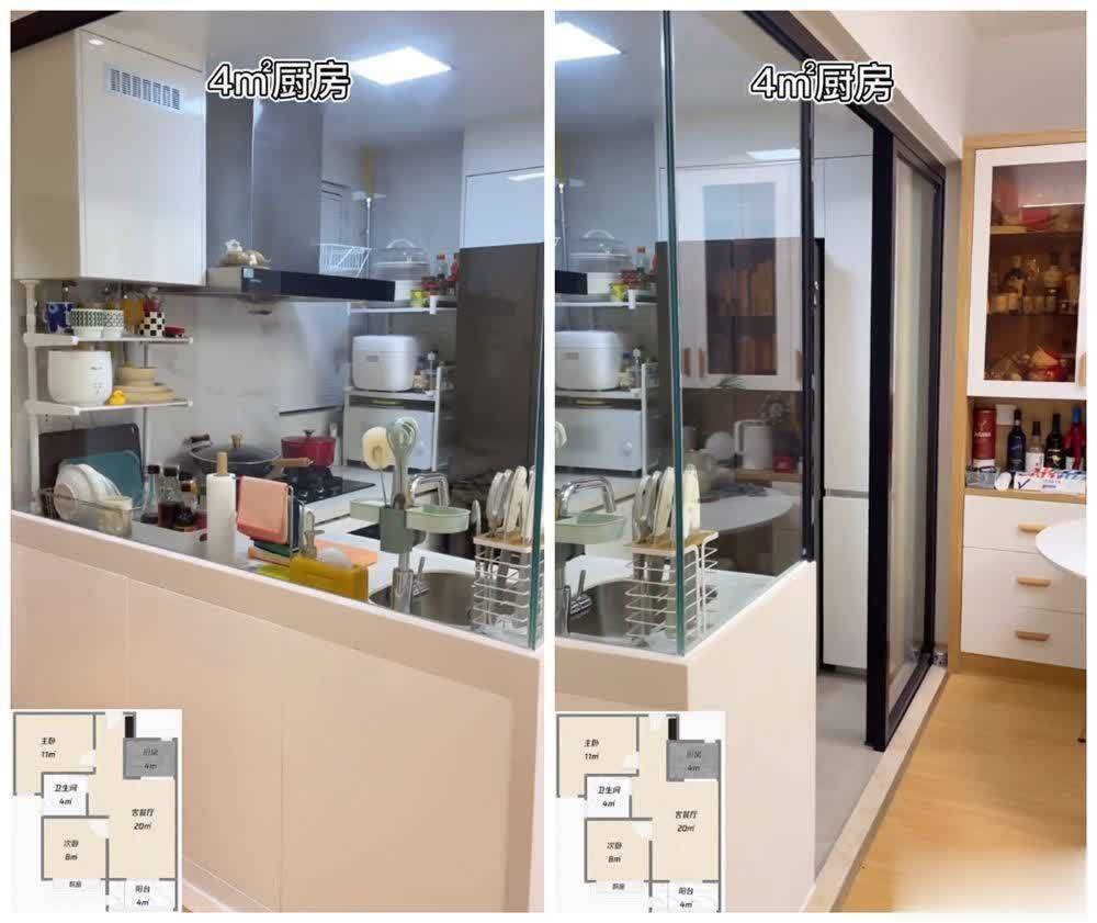厨房面积仅4㎡,为让操作更顺遂,作念成U形橱柜神气,践诺了台面切菜和置物空间。