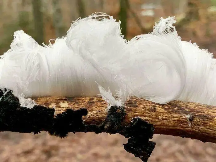 13、毛茸茸的冰丝,是由树枝上冒出的水蒸汽凝结而成,是一种不太常见的当然风物。