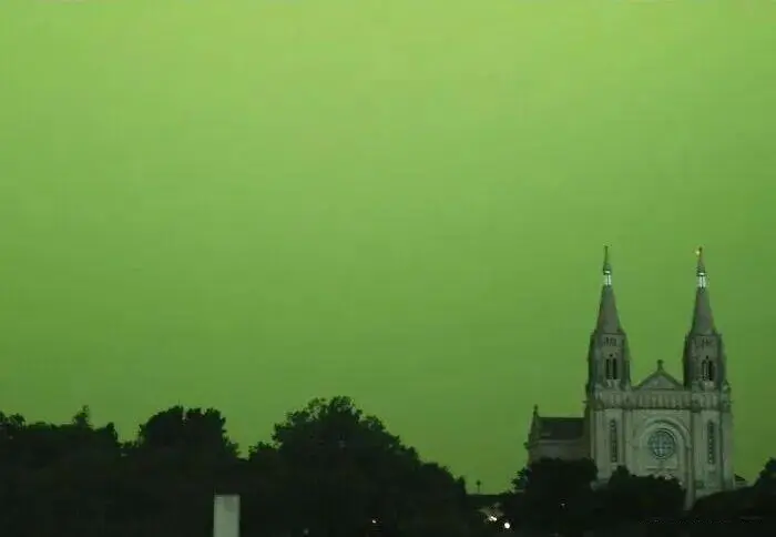 15、绿色的天外,这幅图片并莫得经由罕主见决,之是以出现这种情况,是由蓝光(来自雨水、冰雹和悬浮水)和黄光(来自低空的太阳)共同作用酿成的。